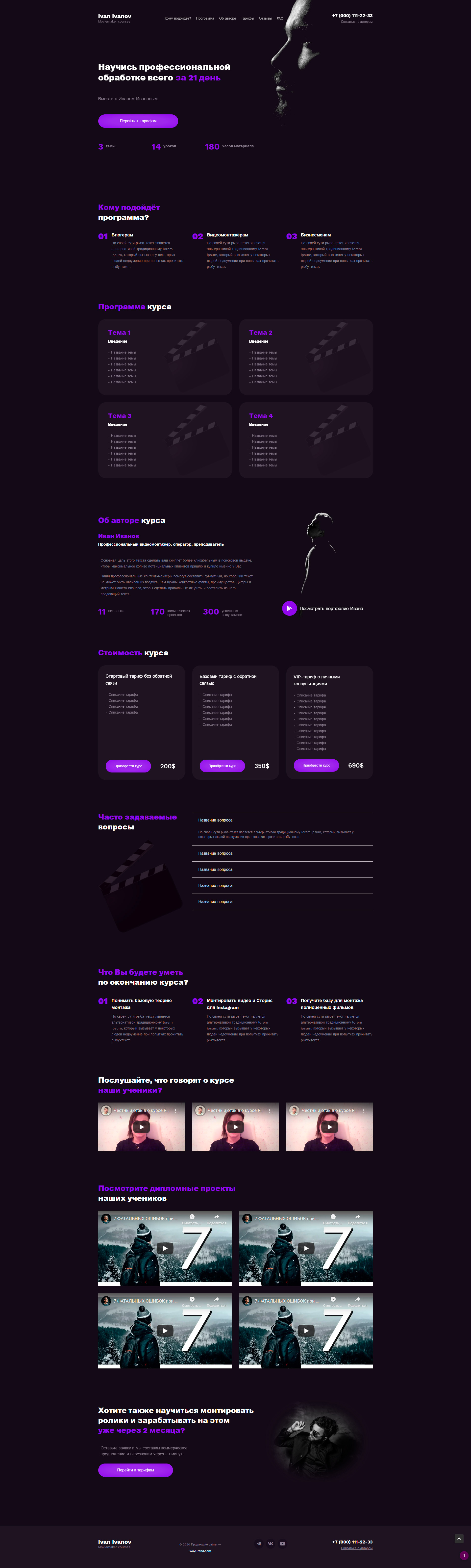 - Промоблок "Научись профессиональной обработке всего за 21 день" с кнопкой призыва к действию "Перейти к тарифам"