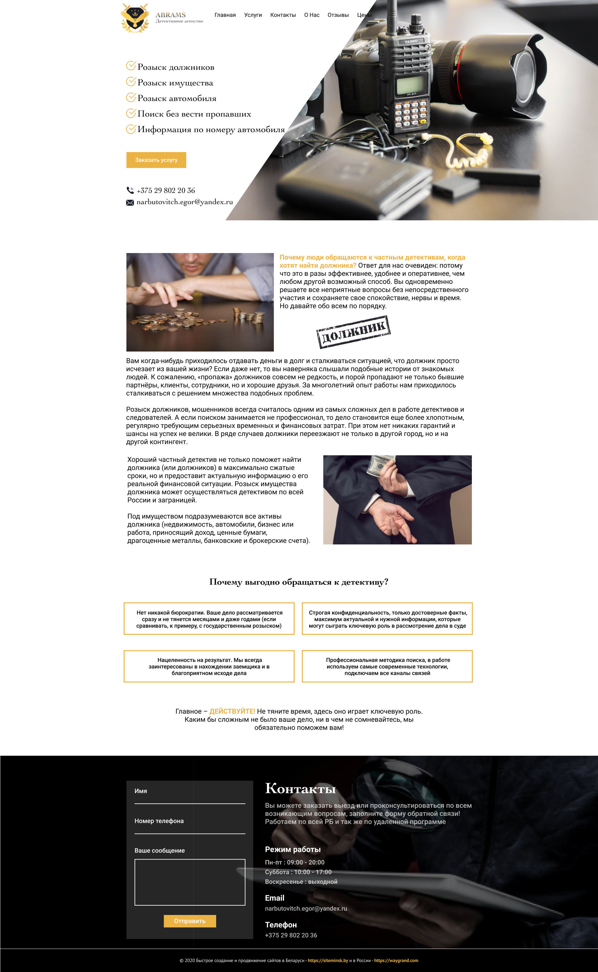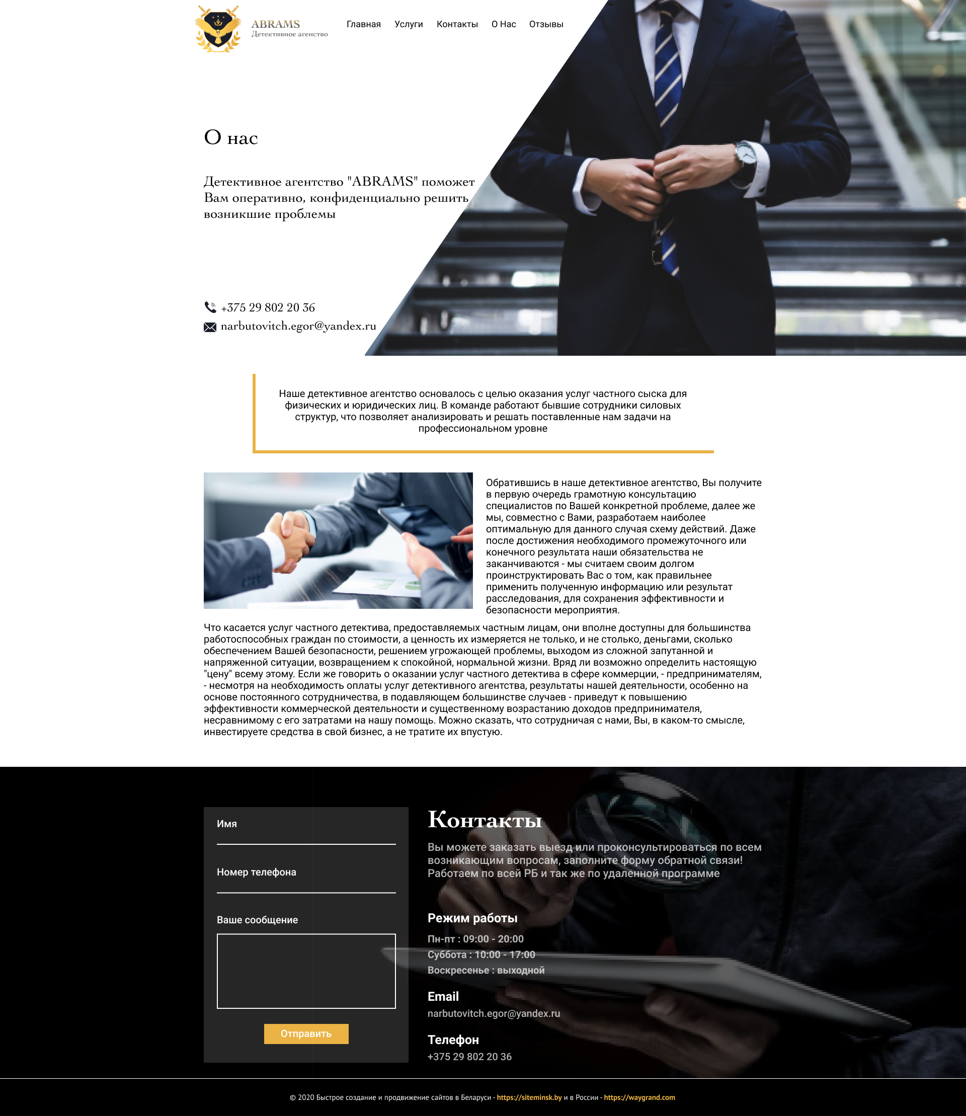Закажите готовый продающий сайт визитка #239 в Молодечно за 5-7 дня «под ключ»: свёрстан, отрисован и готов к рекламе. Тематика шаблона «Частное детективное агентство».